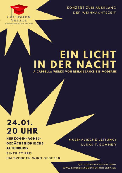Der Studierendenchor der Uni Jena singt am 24.01.2026 um 20.00 Uhr ein Konzert zum Ausklang der Weihnachtszeit in der Herzogin-Agnes-Gedächtniskirche. Auf dem Programm stehen
