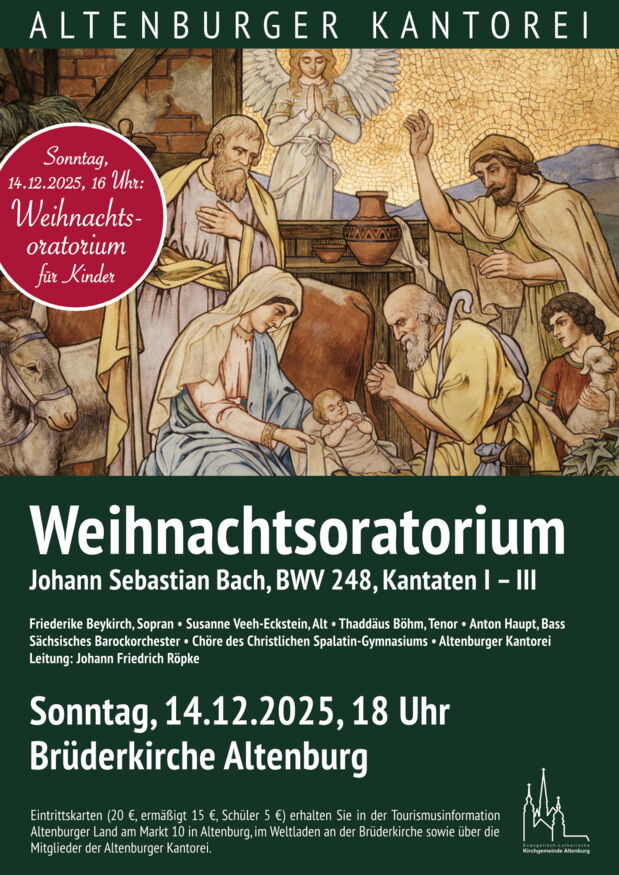 Traditionell führt die Altenburger Kantorei am 3. Advent die Kantaten I-III von Bachs Weihnachtsoratorium auf. Das Werk ist für seine vielfältigen musikalischen Ausdrucksformen mit jubelnden Chören, schlichten Chorälen und wunderschönen Arien sowie seine bildhafte, lebendige Erzählung der Weihnachtsgeschichte bekannt und auch beim Altenburger Publikum äußerst beliebt.