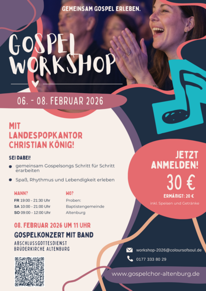 Der Workshop endet mit einem gemeinsamen Gospel-Gottesdienst am 8.2.2026, 11 Uhr, in der Brüderkirche, in dem die erlernten Songs mit Band erklingen werden und zu dem auch Familien, Freunde und Interessierte herzlich eingeladen sind.
